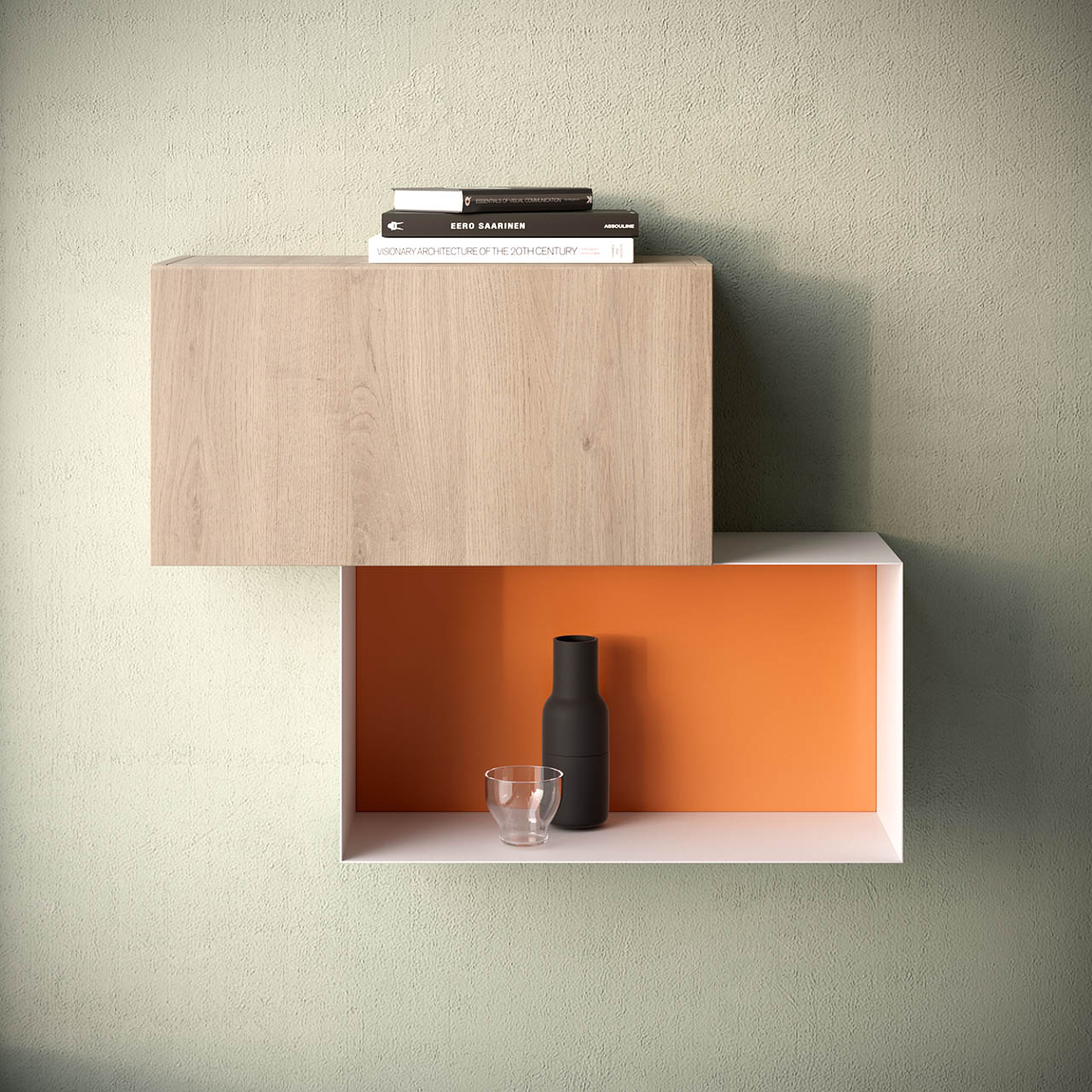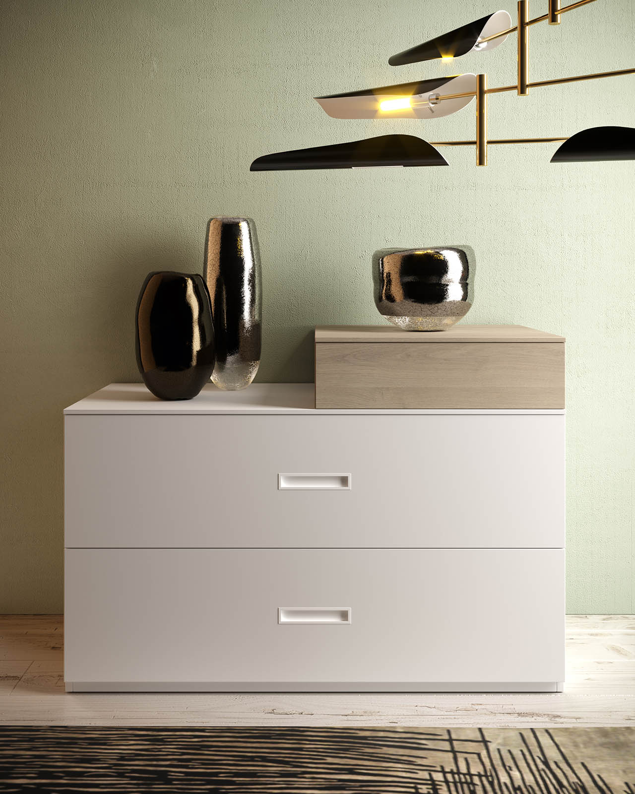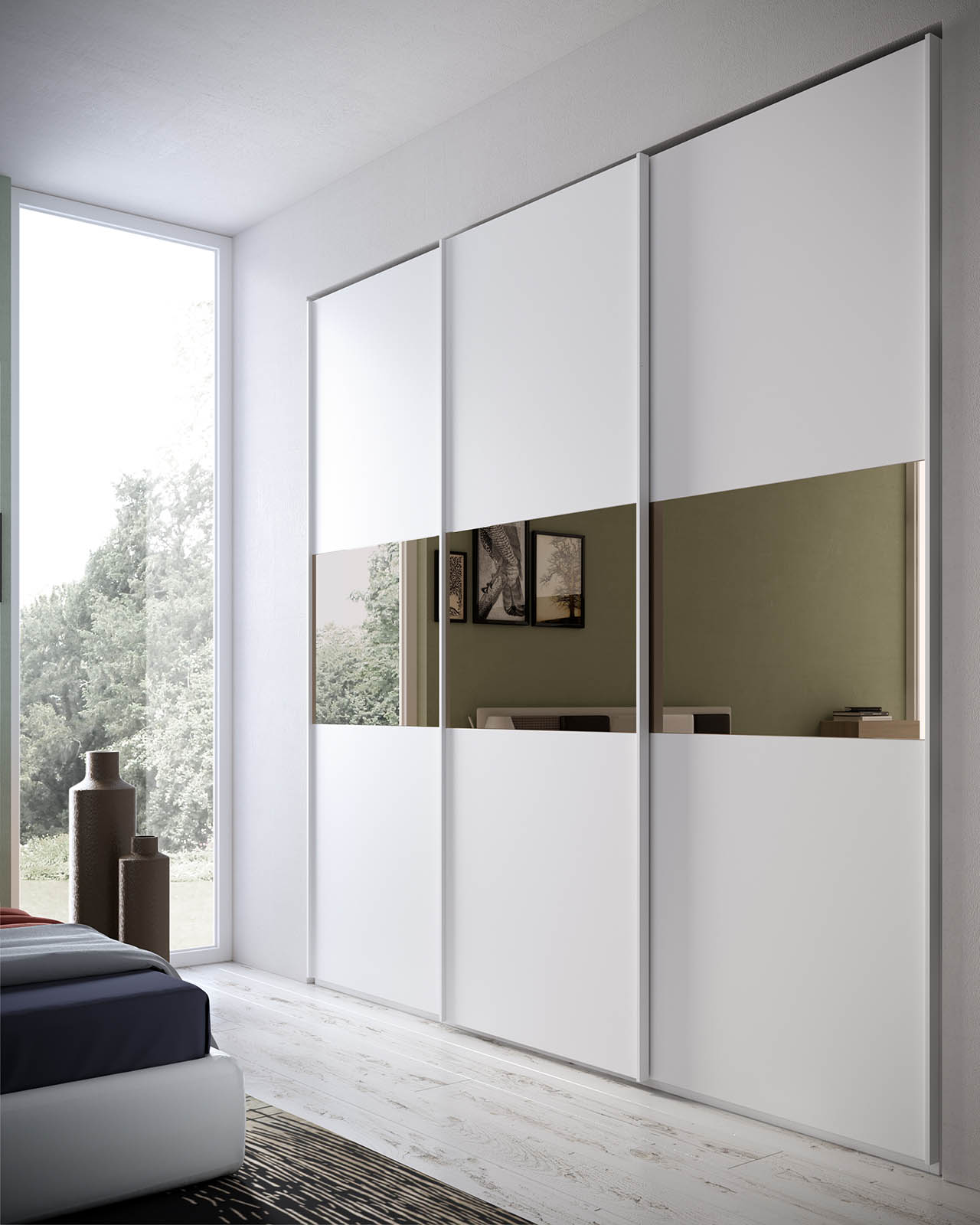 In questa camera da letto Galm Design l’armadio presenta un inserto in vetro bronzato. Le maniglie incasso sono in tinta. Le aperture dell’armadio sono di tipo push-pull. I comodini in lamiera presentano il retro a colore. La testata del letto matrimoniale è con cuscini cambiabili e asportabili.