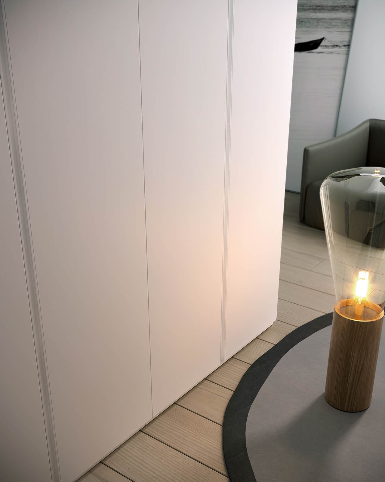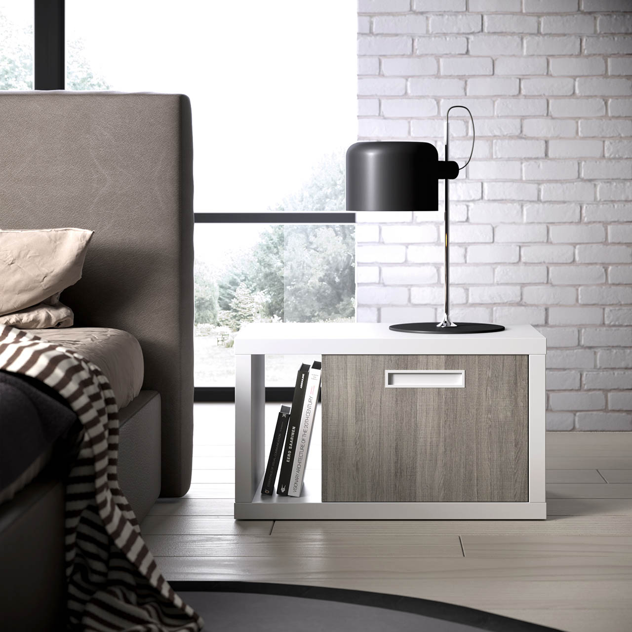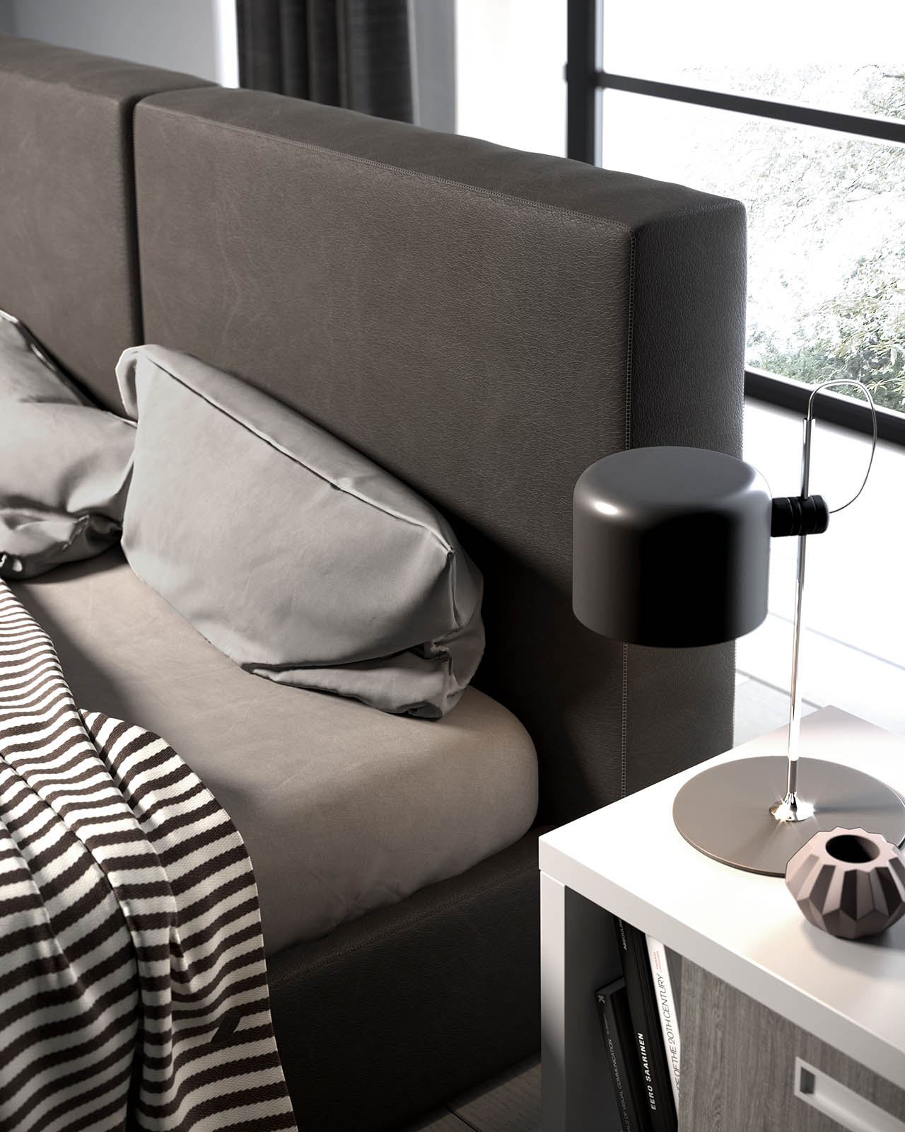In questa camera da letto Galm Design l’inserto laccato presenta una maniglia a gola. Comodini e comò sono incorniciati. Il letto matrimoniale è imbottito in ecopelle invecchiata. I comodini presentano un pratico vano porta libri.